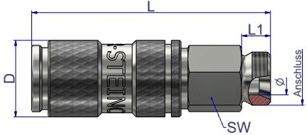 Technik: Zweihandkupplung mit automatischer 5-Punkt Verriegelung. Verriegelungselemente sind Kugeln, die durch eine federbelastete Entriegelungshülse gesperrt werden. Um ein unbeabsichtigtes Entkuppeln zu vermeiden ist der Entriegelungsvorgang nur möglich durch ein beabsichtigtes Eindrücken des Steckers in die Kupplung. Nur so werden die Verriegelungselemente frei und die Entriegelungshülse kann in Richtung Anschluss bewegt werden damit der Stecker aus der Kupplung entnommen werden kann. Das Ventil bewegt sich in die ursprüngliche Lage zurück und schließt die Kupplung.